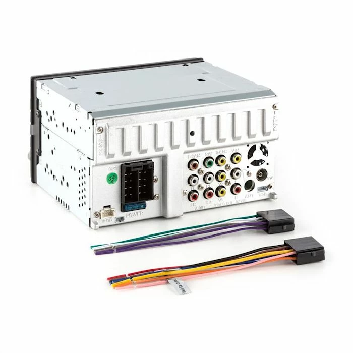 - Connexions: 1 x ports USB, 1 x slot pour carte SD / MMC, 1 x entrées AUX stéréo jack 3,5mm, 1x entrée RCA stéréo enceinte, 2 x entrées vidéo RCA, 1 x entrée RCA caméra, 1 x sortie subwoofer RCA, 2 x sorties vidéo RCA, 1 x jack antenne