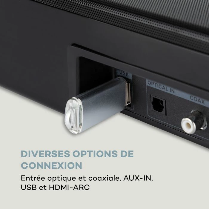 - Connexions : 1 x entrée optique, 1 x entrée coaxiale, 1 x entrée AUX (audio 3,5 mm), 1 x HDMI ARC, 1 x port USB