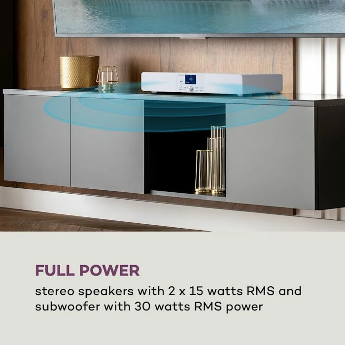 - Pleine puissance : enceintes stéréo 2 x 15 watts RMS et subwoofer de 30 watts RMS
