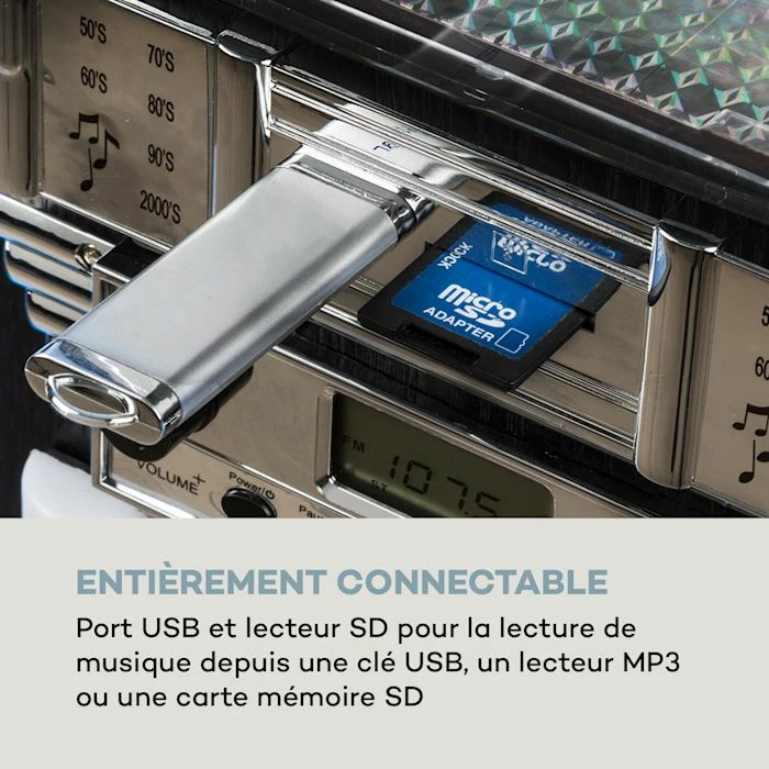- Entièrement connecté : port USB et lecteur SD pour la lecture de musique à partir de clés USB, lecteurs MP3 et cartes mémoire SD