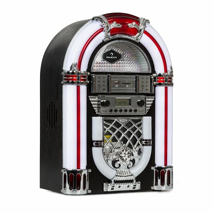 Le tuner FM intégré comprend une échelle de bande de fréquence analogique et une recherche manuelle des stations. De plus, le Jukebox auna Arizona dispose de ports USB et SD compatibles MP3 pour la lecture de fichiers musicaux à partir de clés USB, de lecteurs MP3 et de cartes SD. Atout majeur, la fonction Bluetooth intégrée qui permet de connecter intuitivement un appareil compatible Bluetooth tel qu’un smartphone, un ordinateur portable ou une tablette. L’élégant lecteur CD encastré à l’avant de l’appareil attire également tous les regards. Il lit également les CD MP3 en plus des CD audio classiques. Le boîtier design en chêne avec de nombreux détails est souligné par une ligne courbe avec garniture chromée. Quatre patins de caoutchouc protègent également le sol des dommages indésirables. Le Jukebox auna Arizona est également doté d’un système SRC LED Lighting qui fournit un éclairage authentique avec 7 variations permettant d’avoir une lumière fixe ou de couleur changeante. Avec sa taille compacte, le Jukebox convient particulièrement bien por être installé sur une table ou une commode.