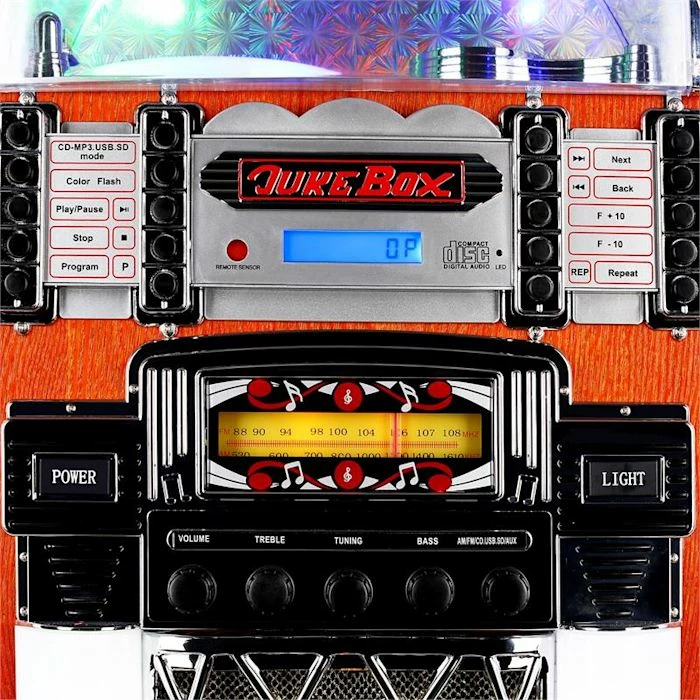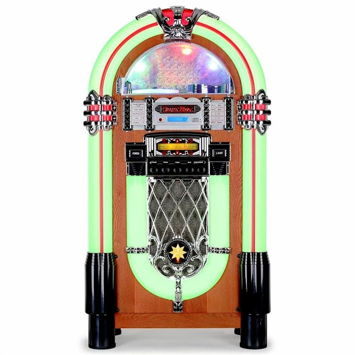 La music box Auna Graceland XXL transforme n’importe quelle pièce en véritable diner américain hyper stylisé. Le design classique du jukebox, typique des golden fifties, ne laisse cependant rien présager des fonctionnalités modernes qui se cachent dans cet appareil.