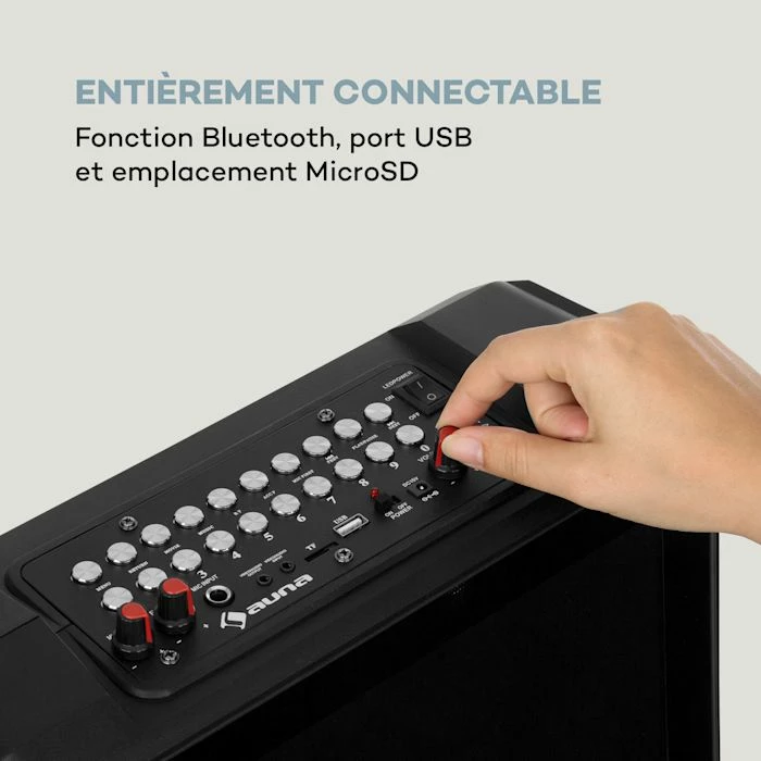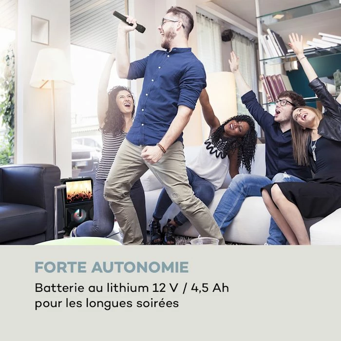 C’est l’heure des grandes performances de chant : l’enceinte mobile de karaoké auna CenterStage 8 impressionne avec don écran couleur TFT de 14.1″ (35,8 cm) qui permet d’afficher les paroles en mode karaoké classique, ainsi que des vidéos dans les formats MP4, AVI, FLV, ASF RMVB, MOV, MKV et 3PG. Bien sûr, la puissance audio nécessaire est également prévue – une enceinte de 8″ (20,3 cm) avec technologie XMR Bass promet un son stable avec une haute qualité sonore. Grâce à la fonction Bluetooth, vous pouvez facilement diffuser d’innombrables fichiers musicaux depuis un smartphone, une tablette ou un ordinateur portable. Un port USB et un lecteur MicroSD offrent également la possibilité de lire de la musique et des vidéos avec l’enceinte karaoké mobile auna CenterStage 8. Le micro sans fil VHF fourni vous permet de vous déplacer librement comme une rockstar sans jamais être coincé dans les boucles de câbles. La fonction Music2Light transforme l’entrée de son et plonge l’environnement du CenterStage 8 dans un éclairage séduisant avec sa lumière LED intégrée rappelant une vraie piste de danse. Une batterie au lithium de grande autonomie et économe en énergie de 12 V / 4,5 A et la poignée de chariot donnent au CenterStage 8 cette mobilité particulière qui fait son succès. La télécommande incluse offre également un contrôle pratique à distance.