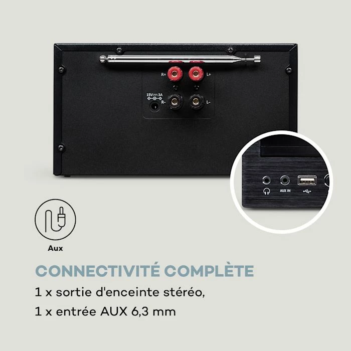 - Connexions : 1 x sortie haut-parleur, 1 x entrée AUX, 1 x sortie casque