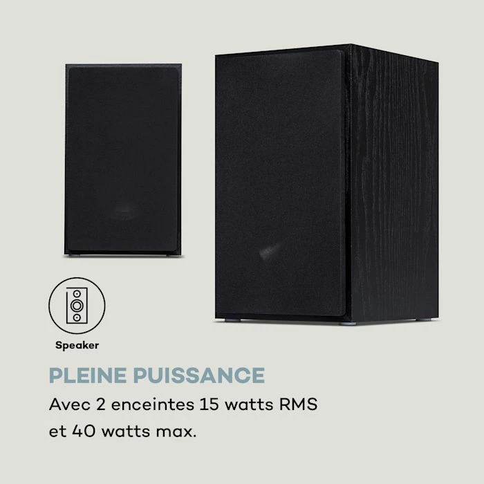 - Pleine puissance : avec 2 haut-parleurs de 15 watts RMS et 40 watts max.
