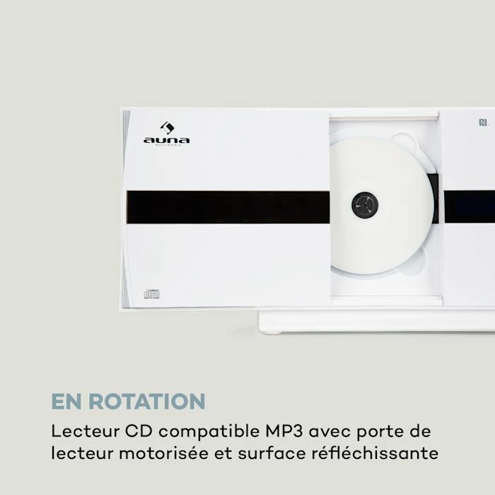 • C’est ici que ça se passe : Lecteur CD compatible MP3 avec panneau d’entraînement motorisé et surface réfléchissante