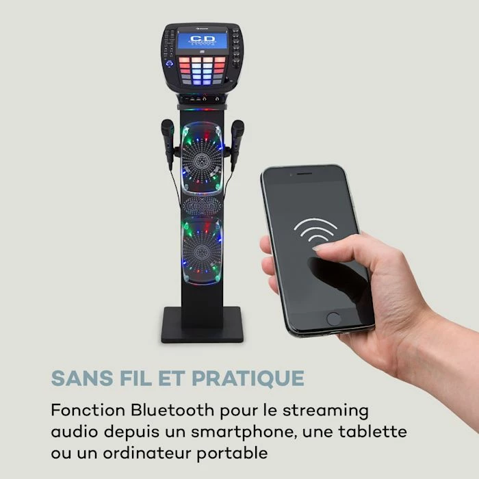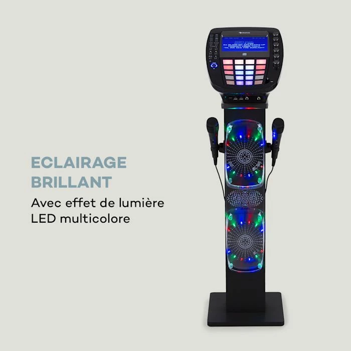 - Ensemble karaoké élégant avec écran couleur TFT 7″ (16:9), Connexion Bluetooth haut-parleur intégré à large bande