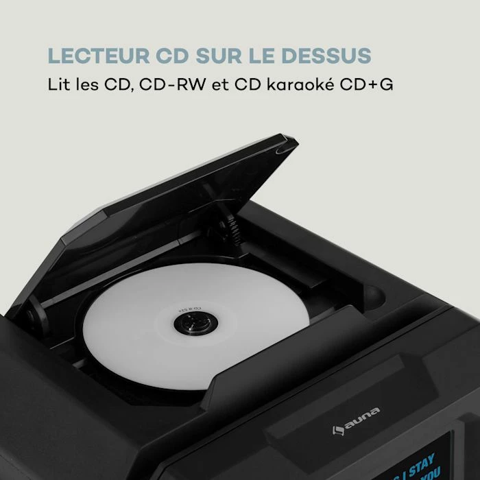 - Lecteur CD sur le dessus : lit les CD, CD-RW et CD de karaoké CD + G