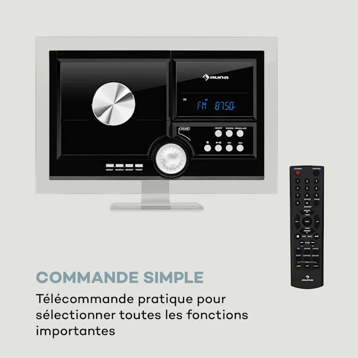 - Connexions : 1 x port USB, 1 x entrée AUX, 1 x entrée d’antenne, 1 x sortie d’enceinte