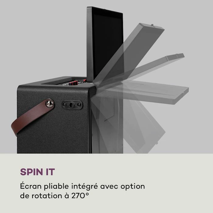 Le système karaoké auna Pro Spin 8 est l’appareil idéal pour tous les amateurs de karaoké grâce à sa sangle de transport, son grand écran tactile, ses 2 micros UHF sans fil et sa batterie performante.