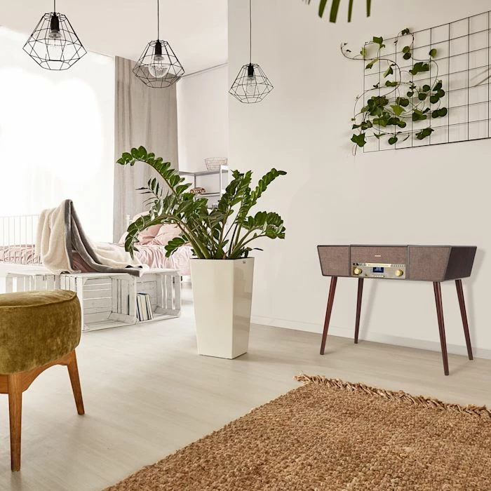- Véritable look rétro : solide boîtier MDF avec éléments décoratifs couleur laiton et 4 solides pieds