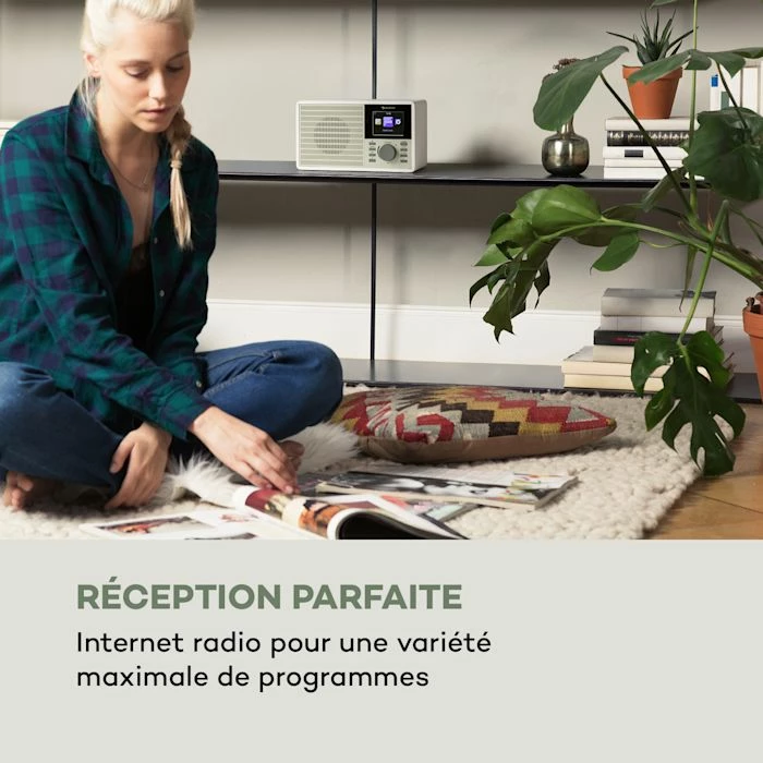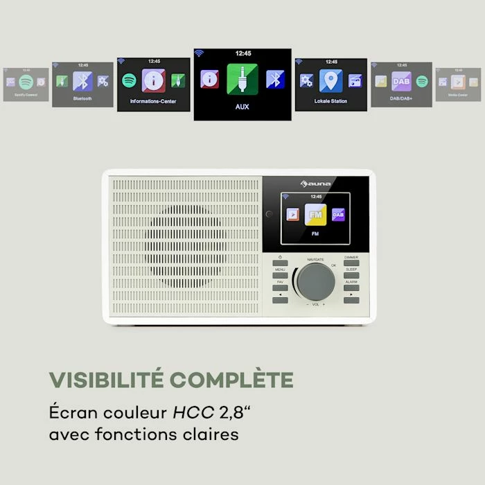 - 3 alarme réglables par tonalité d’alarme, mélodie, radio Internet ou USB
