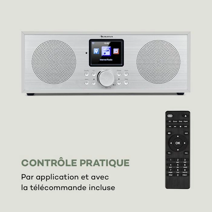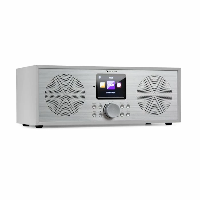 Il est temps de profiter d’un son de haute qualitĂ© ! Avec la radio Internet DAB+/FM auna Silver Star, vous pouvez offrir Ă votre foyer un appareil musical polyvalent combinant des performances puissantes, des fonctionnalitĂ©s multiples et un design Ă©lĂ©gant en un seul appareil. Avec une puissance de sortie de 2 x 8 watts RMS, la radio tout-en-un prĂ©sente la meilleure qualitĂ© de son pour un Ă©lĂ©ment stationnaire dans la cuisine, la salle de bain ou le salon. La fonction Bluetooth intĂ©grĂ©e est idĂ©ale pour les connexions sans fil, car elle permet de lire le contenu multimĂ©dia des pĂ©riphĂ©riques externes rapidement et facilement. L’interface WiFi de la radio permet de recevoir jusqu’Ă 10 000 stations de radio Internet et d’utiliser l’appareil en tant que lecteur rĂ©seau. La radio est couplĂ©e avec d’autres appareils sur le rĂ©seau via l’application Air Music Control et permet la diffusion de musique par le protocole norme UPnP/DLNA. Avec le tuner DAB+, vous pouvez recevoir en qualitĂ© numĂ©rique toutes les stations de radio en plus du tuner FM analogique, et profiter ainsi de la meilleure qualitĂ© sonore avec un son stable et sans parasite. Les services texte et image supplĂ©mentaires de DAB+ sont principalement mis en valeur par l’Ă©cran gĂ©nĂ©reux : les guides de programmes, les informations, les nouvelles, les morceaux de musique sont facilement lus sur un Ă©cran HCC de 2,8″ (7 cm, contraste Ă©levĂ© et couleur). Ceux qui voudraient aussi utiliser d’autres sources de musique disposent de l’entrĂ©e ligne et d’un port USB Ă l’arrière qui ouvrent le système audio Ă d’autres sources sur smartphone, ordinateur portable, lecteur USB et lecteur MP3. La radio Intenet se controle par son panneau de commande Ă l’avant ou confortablement via la tĂ©lĂ©commande ou l’appli Air Music Control. La fonction d’alarme avec double alarme programmable et le mode snooze se rĂ©vèle Ă©galement utile. Au-delĂ des dĂ©tails techniques, la radio sĂ©duit aussi avec son cadre en bois qui donne son Ă©lĂ©gance particulière Ă cet appareil polyvalent avec surface de contrĂ´le en aluminium et augmente ainsi la valeur de l’appareil.