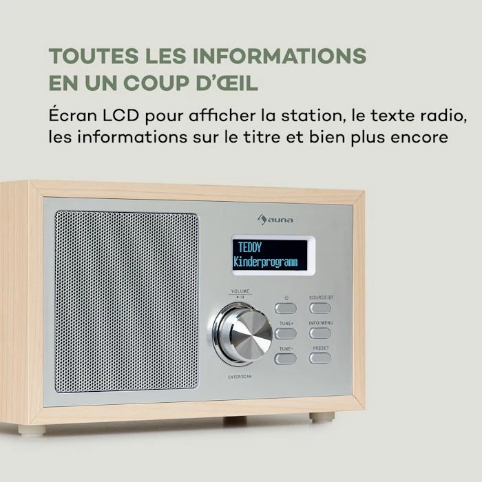 - Bonne visibilité de toutes les informations: affichage LCD indiquant l’émetteur, le texte radio, les titres, …