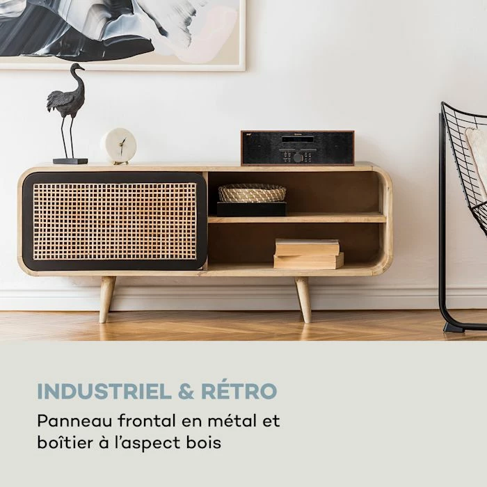 - Industriel & rétro : panneau frontal en métal et boîtier à l’aspect bois