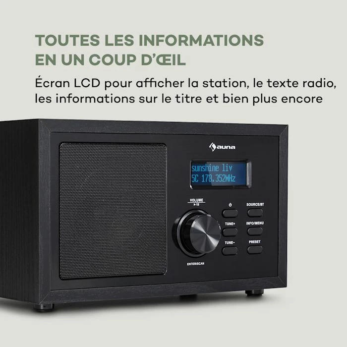 - Toutes les informations en un coup d’œil : écran LCD pour l’affichage de la station, du texte radio, des informations sur les titres et bien plus encore.