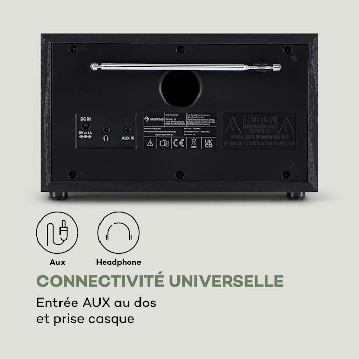 - Connexions : 1 entrée AUX sur jack 3,5 mm, 1 sortie casque sur jack 3,5 mm
