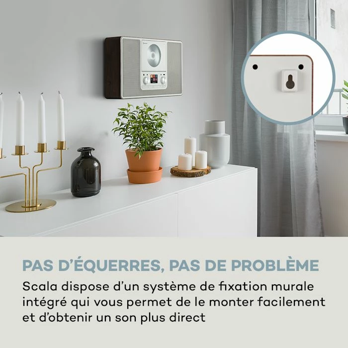 Système complet plat pour table ou mur : la radio numérique auna Scala VCD apporte non seulement de la variété musicale dans la meilleure qualité audio par simple appui sur un bouton, mais vous fournit également un éclairage d’ambiance pour chaque occasion.