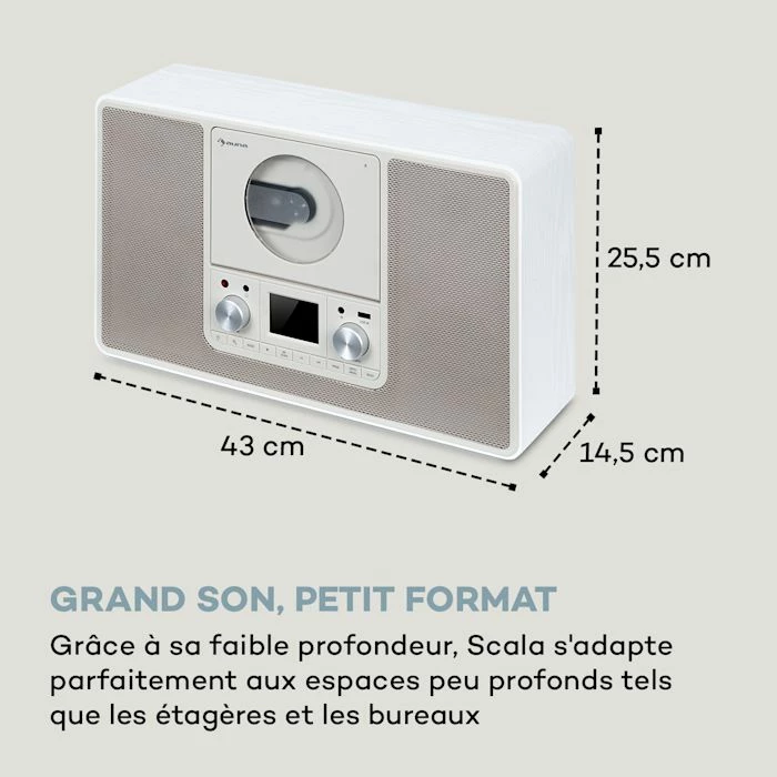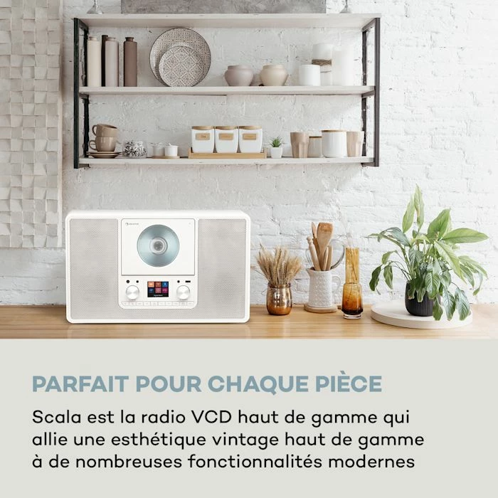 Système complet plat pour table ou mur : la radio numérique auna Scala VCD apporte non seulement de la variété musicale dans la meilleure qualité audio par simple appui sur un bouton, mais vous fournit également un éclairage d’ambiance pour chaque occasion.