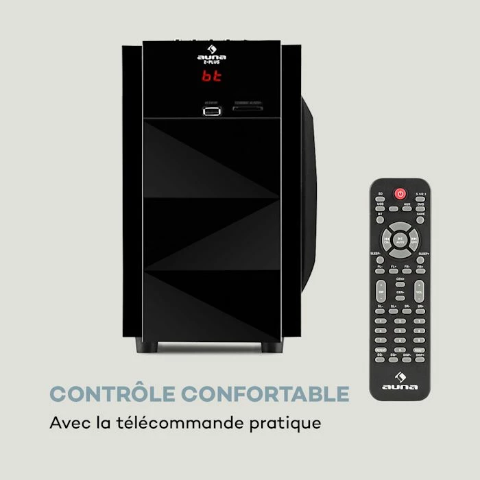 Le système d’enceintes Auna Z-Plus 5.1 de 70 watts RMS prend en charge le signal surround entrant et le distribue aux 5 x enceintes satellites compactes de 3″ (7,5 cm) et au puissant Subwoofer OneSide Bass Reflex de 6.5″ (16,5 cm). L’entrée stéréo RCA peut accueillir les appareils audio de toutes sortes – Playstation, lecteur CD et lecteur MP3, ordinateur portable ou encore la télévision – pour que le système d’enceintes auna Z-Plus 5.1 leur apporte une grande valeur ajoutée audio. Le port USB avant communique avec des supports de données tels qu’une clé USB et un lecteur MP3, et vous pouvez insérer les cartes mémoire contenant des fichiers MP3 dans le lecteur SD / MMC. Les composants individuels du système d’enceintes Auna Z-Plus 5.1 sont bien équilibrés entre eux, le volume total s’adapte facilement à votre intérieur et à vos préférences audio avec les boutons-poussoirs ou la télécommande afin d’obtenir une variété de sons optimale. Le Concept Balanced Sound assure également une reproduction particulièrement équilibrée et uniforme du son.
