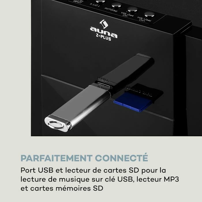 - Parfaitement connecté : port USB et lecteur de cartes SD pour lire de la musique depuis une clé USB, un lecteur MP3 ou une carte mémoire SD