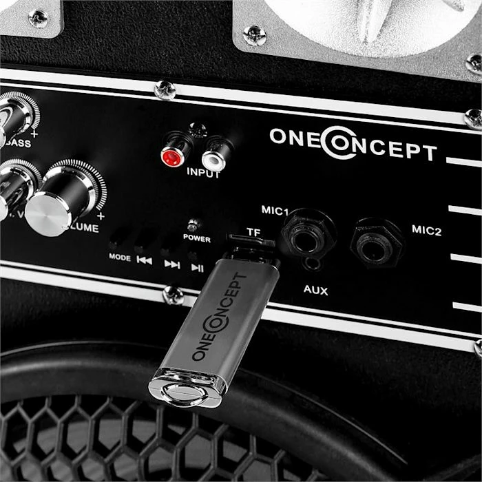 - connectique: 1 x port USB, 1 x entrée microSD, 2 x entrées jack 6,3mm microphone, 1 x entrée jack 3,5mm AUX, 1 x entrée stéréo RCA ligne, 1 x paire de connexion enceinte (sur chaque enceinte)