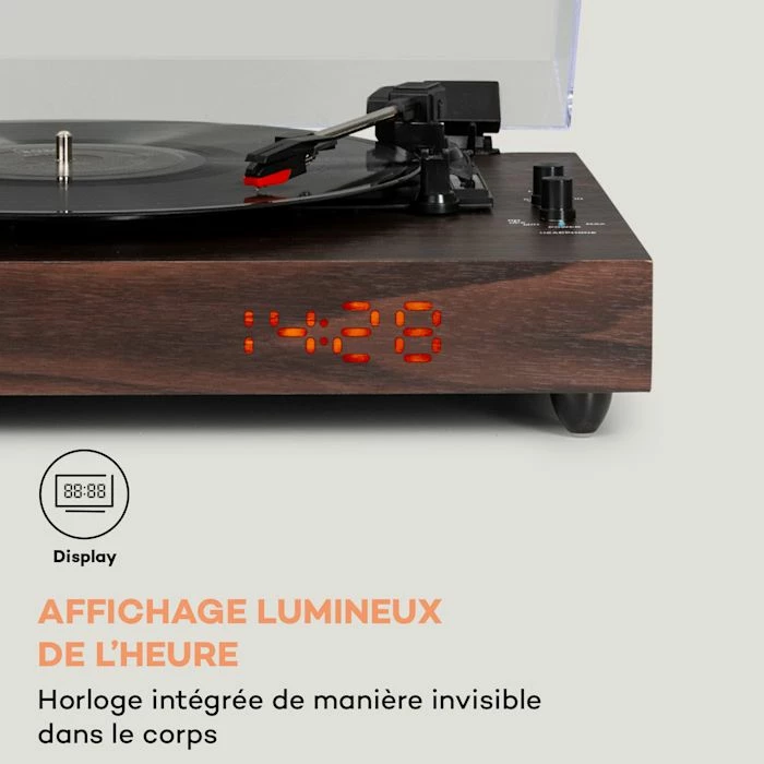 Des expériences musicales classiques pour les connaisseurs : avec style, élégance et une image sonore inimitable, la platine TT-Classic Chrono de aunatire ses superbes sons des disques vinyls Les haut-parleurs stéréo intégrés sont presque invisibles et vous permettent de mettre la platine immédiatement en service. En plus de la reproduction sonore classique via l’aiguille, le TT-Classic Chrono de auna vous offre les technologies les plus modernes qui font battre plus fort le cœur de tout musicien. Presque invisible, une horloge LED pratique s’allume sur son corps.