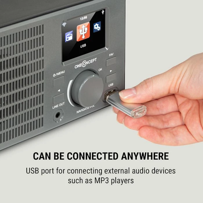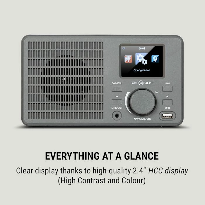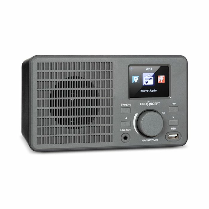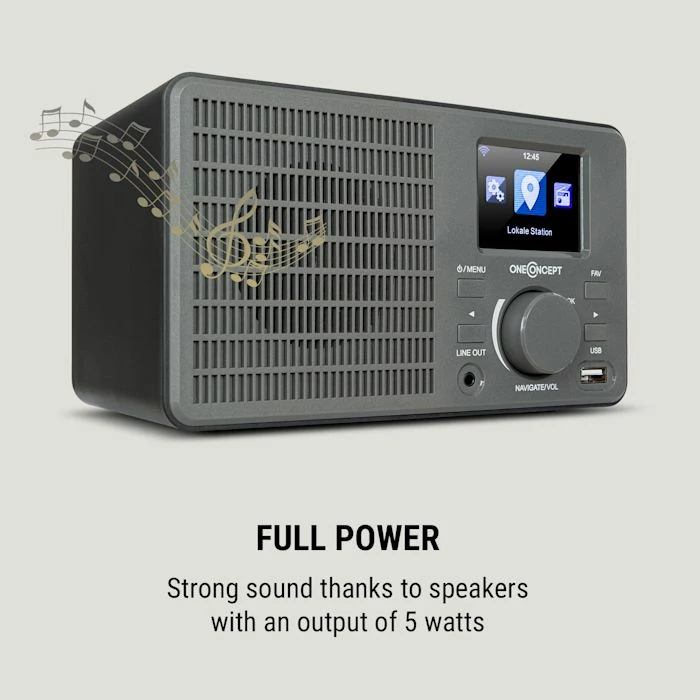 Découvrez tout l’univers de la musique dans un récepteur riche en fonctionnalités et au design rétro chic avec la radio Internet oneConcept TuneUp.